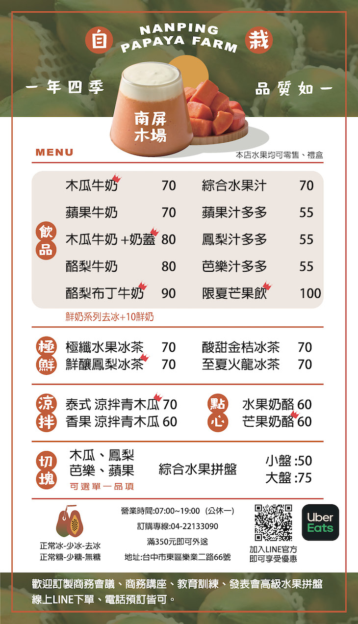 主打木瓜專賣所的【南屏木場-木瓜專賣所】,除了招牌必喝——甜香不膩、新鮮純淨的木瓜牛奶外,也精心挑選各樣時令新鮮的水果,調製一杯又一杯,果香豐盈、沁涼可口的水果冰茶或者水果牛奶⋯⋯精緻、細膩的口味,一滿您的口腹之慾同時,也喝得安心又健康!