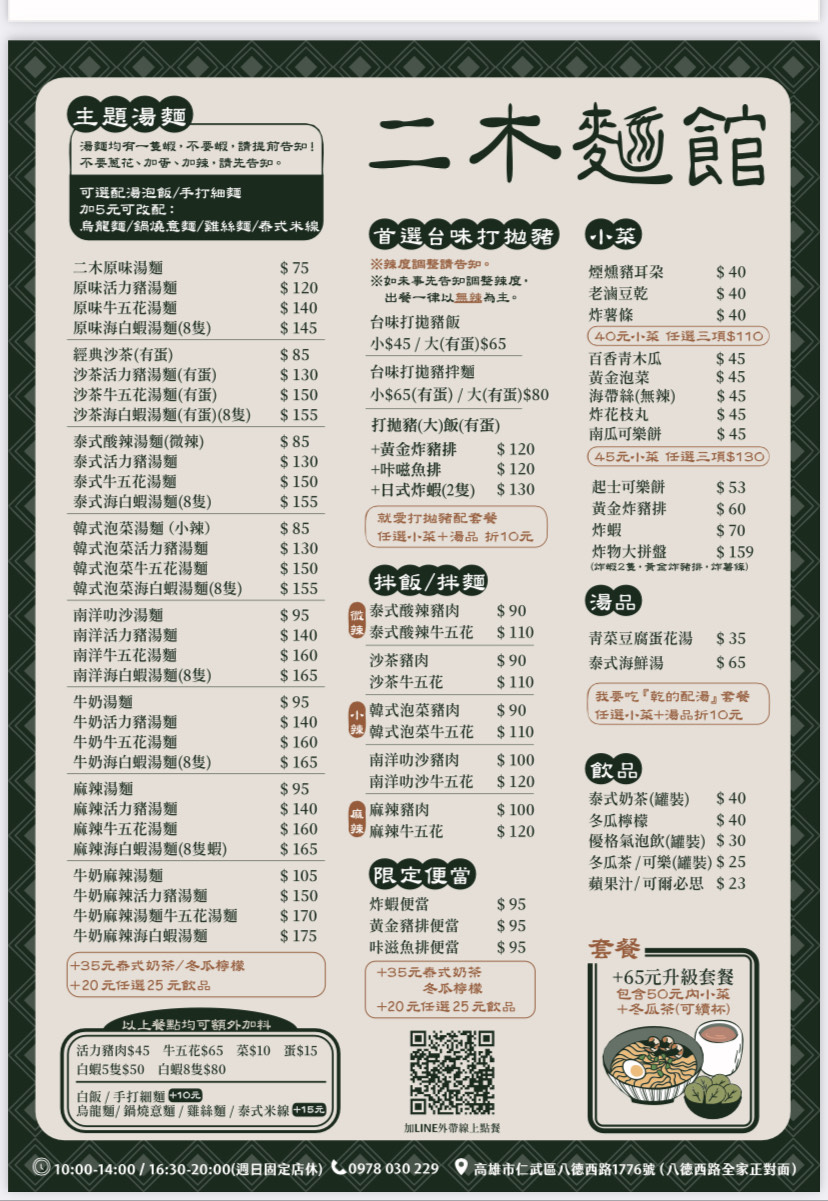 【二木麵館】主打各種風味麵食,豐富的湯頭選擇,有泰式、有韓式、有南洋風,還有經典的台灣味…精燉湯頭,呈現各有千秋的美味,天天吃,也不會膩!