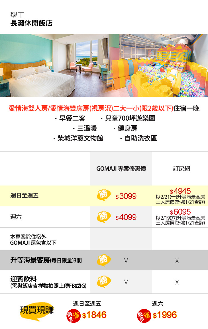 ★ 麻吉享:1.升等海景客房(每日限量)3間、2.迎賓飲料(需與飯店吉祥物拍照上傳FB或IG)!