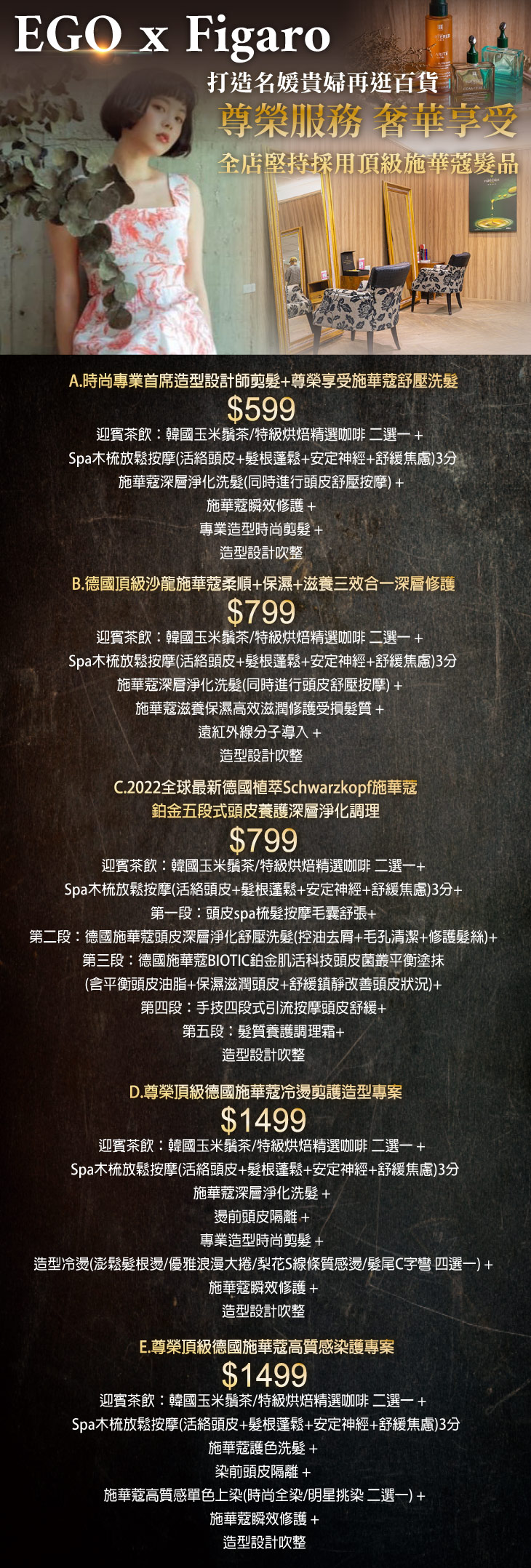 A.時尚專業首席造型設計師剪髮+尊榮享受施華蔻舒壓洗髮 / B.德國頂級沙龍施華蔻柔順+保濕+滋養三效合一深層修護 / C.2022全球最新德國植萃Schwarzkopf施華蔻鉑金五段式頭皮養護深層淨化調理 / D.尊榮頂級德國施華蔻冷燙剪護造型專案 / E.尊榮頂級德國施華蔻高質感染護專案