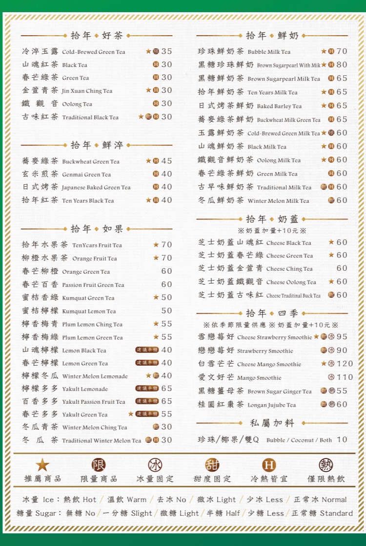 一間別有風味的飲料店,至今已創業10年,十年半載的這段時間裡經歷的風雨,沉澱才明白回到純粹才能走的長遠,原物料及茶葉皆堅持挑選品質最好的,透過細心嫻熟的手法調飲,為您獻上一杯杯充滿溫度的療癒飲品,讓單純的美好滿足您挑剔的味蕾,【拾年茶事】將繼續陪您走過下一個十年!