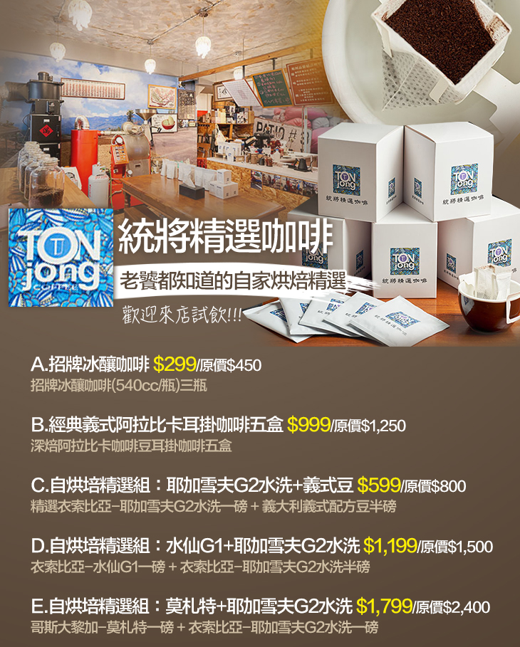 A.招牌冰釀咖啡 / B.經典義式阿拉比卡耳掛咖啡五盒 / C.自烘培精選組:耶加雪夫G2水洗+義式豆 / D.自烘培精選組:水仙G1+耶加雪夫G2水洗 / E.自烘培精選組:莫札特+耶加雪夫G2水洗