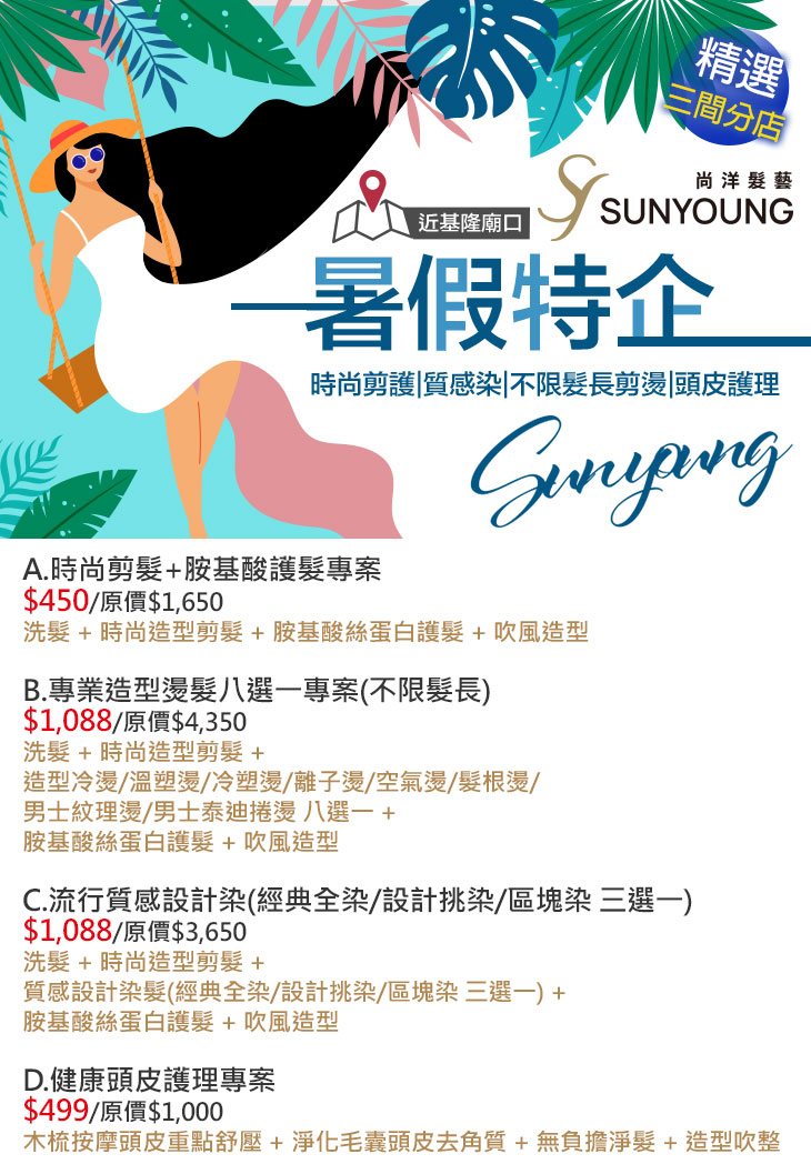 A.時尚剪髮+胺基酸護髮專案 / B.專業造型燙髮八選一專案(不限髮長) / C.流行質感設計染(經典全染/設計挑染/區塊染 三選一) / D.健康頭皮護理專案