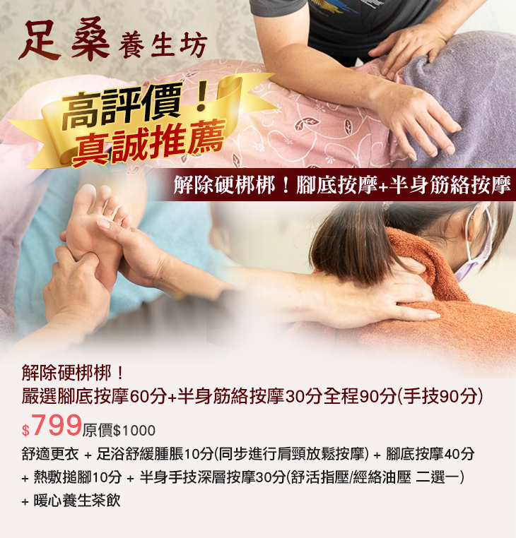 〈舒適更衣 + 足浴舒緩腫脹10分(同步進行肩頸放鬆按摩) + 腳底按摩40分 + 熱敷搥腳10分 + 半身手技深層按摩30分(舒活指壓/經絡油壓 二選一) + 暖心養生茶飲〉