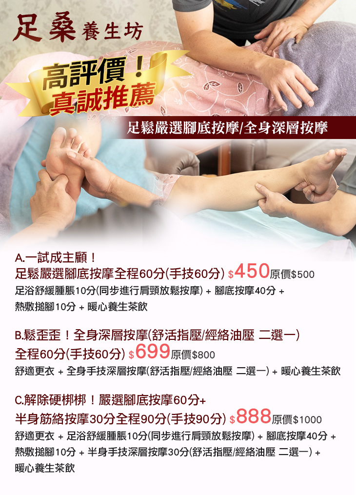 A.一試成主顧!足鬆嚴選腳底按摩全程60分(手技60分) / B.鬆歪歪!全身深層按摩(舒活指壓/經絡油壓 二選一)全程60分(手技60分) / C.解除硬梆梆!嚴選腳底按摩60分+半身筋絡按摩30分全程90分(手技90分)