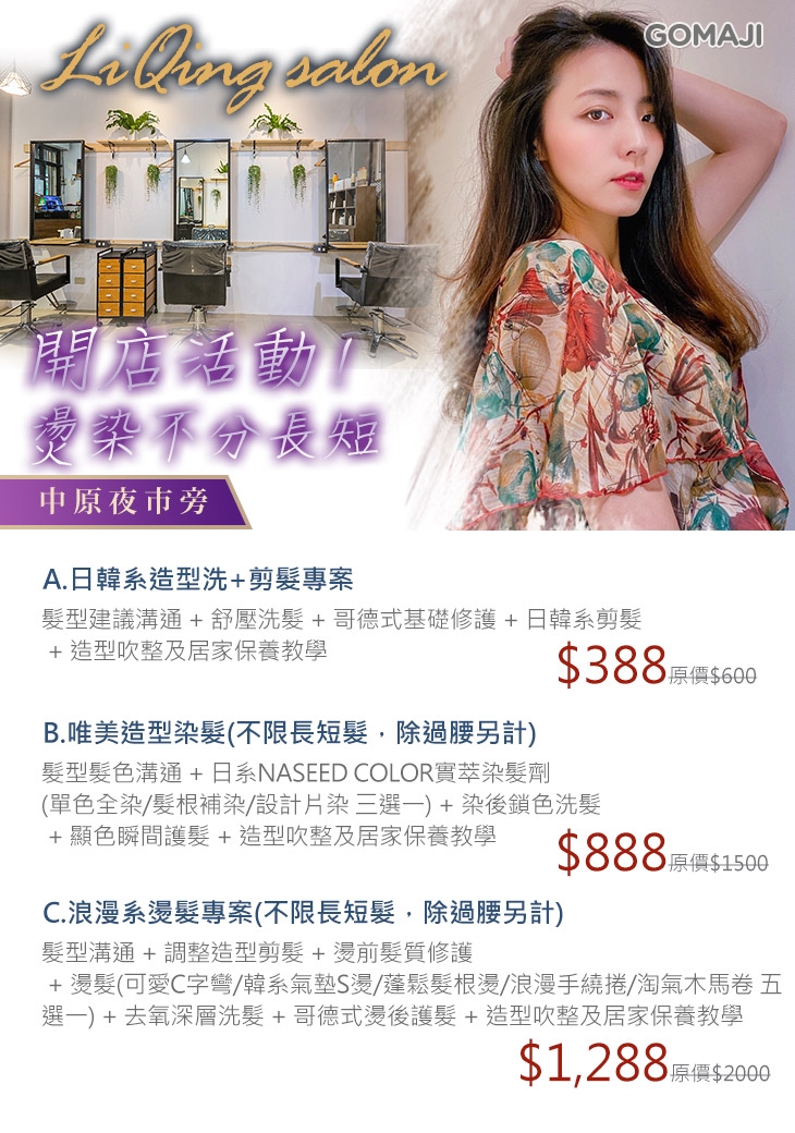 A.日韓系造型洗+剪髮專案 / B.唯美造型染髮(不限長短髮,除過腰另計) / C.浪漫系燙髮專案(不限長短髮,除過腰另計)