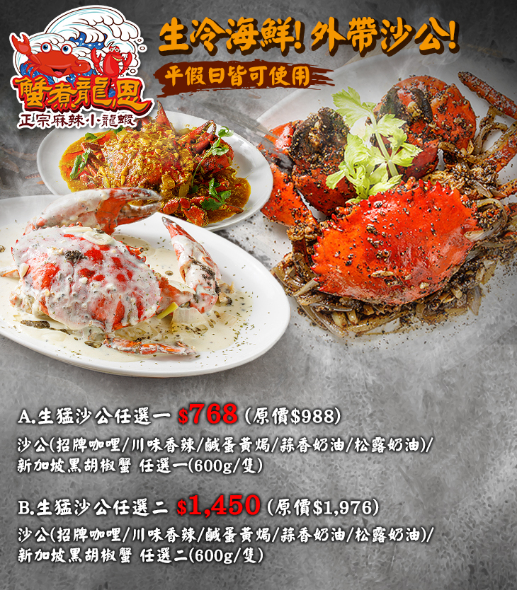 〈沙公(招牌咖哩/川味香辣/鹹蛋黃焗/蒜香奶油/松露奶油)/新加坡黑胡椒蟹 任選二(600g/隻)〉