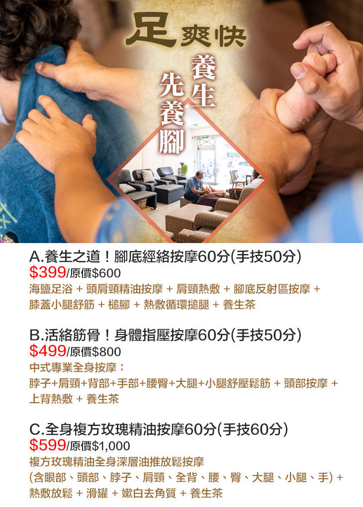 A.養生之道!腳底經絡按摩60分(手技50分) / B.活絡筋骨!身體指壓按摩60分(手技50分) / C.全身複方玫瑰精油按摩60分(手技60分)