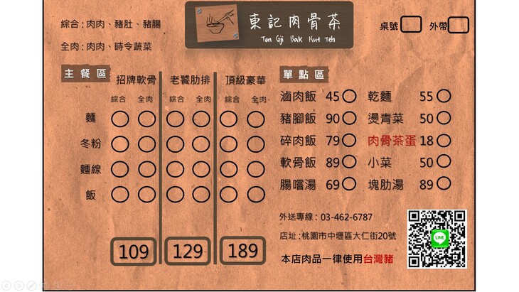 「在這紛紛擾擾的城市,只想帶給您記憶中的好味道。」鄰近中原大學的【東記肉骨茶】,是由年輕老闆與闆娘一同經營的餐廳,店內專賣熱騰騰的肉骨茶,提供招牌軟骨、老饕肋排、頂級豪華等多種主餐系列,食材新鮮、擺盤豐盛,並堅持使用台灣豬肉,每一道餐點都是老闆的心血結晶,愛吃美食的朋友,還不快來【東記肉骨茶】,讓店家好好溫暖您的心與味蕾吧!