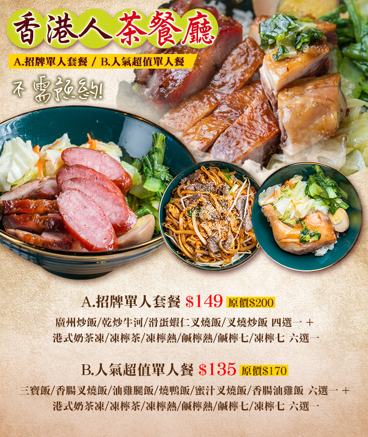 〈廣州炒飯/乾炒牛河/滑蛋蝦仁叉燒飯/叉燒炒飯 四選一 + 港式奶茶凍/凍檸茶/凍檸熱/鹹檸熱/鹹檸七/凍檸七 六選一〉