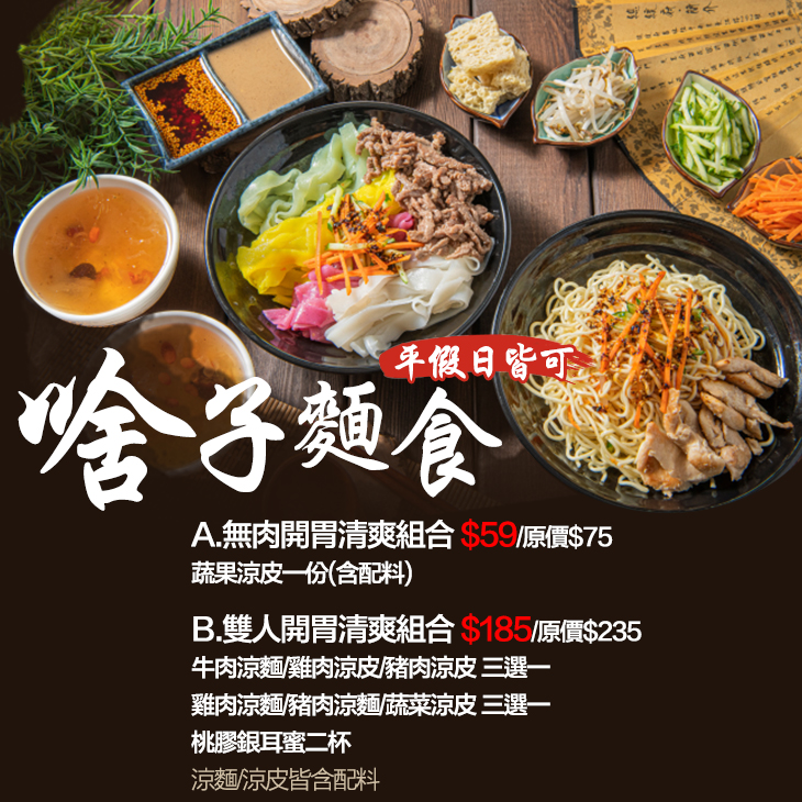 〈牛肉涼麵/雞肉涼皮/豬肉涼皮 三選一 + 雞肉涼麵/豬肉涼麵/蔬菜涼皮 三選一 + 桃膠銀耳蜜二杯,涼麵/涼皮皆含配料〉