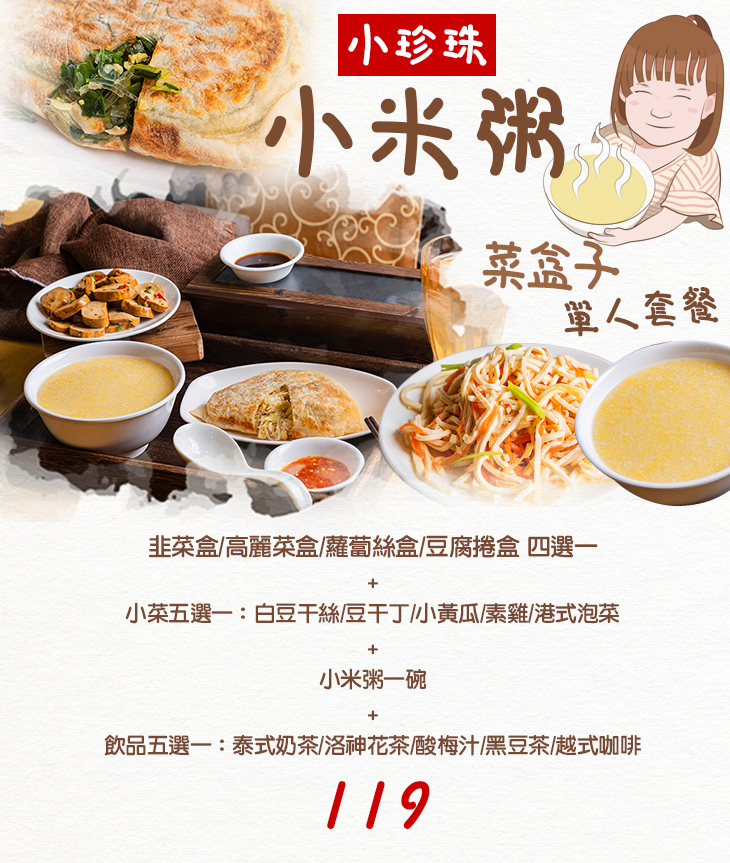 透過天然食材,品質嚴選、新鮮上等,用心烹調出溫潤醇厚的小米粥,以及風味多元的菜盒子、豐盛美味的小菜等,傳遞人情味濃厚的手作溫度給每一位到來的顧客,讓樸實、純粹的經典佳餚,填飽胃口、療癒人心,秉持料理的實在價格、紮實份量及絕佳風味,讓試過的饕客們都意猶未盡、讚不絕口!