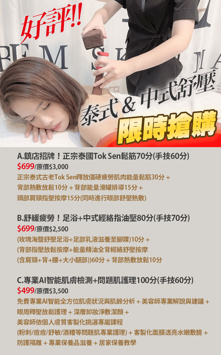 A.鎮店招牌!正宗泰國Tok Sen鬆筋70分(手技60分) / B.舒緩疲勞!足浴+中式經絡指油壓80分(手技70分) / C.專業AI智能肌膚檢測+問題肌護理100分(手技60分)