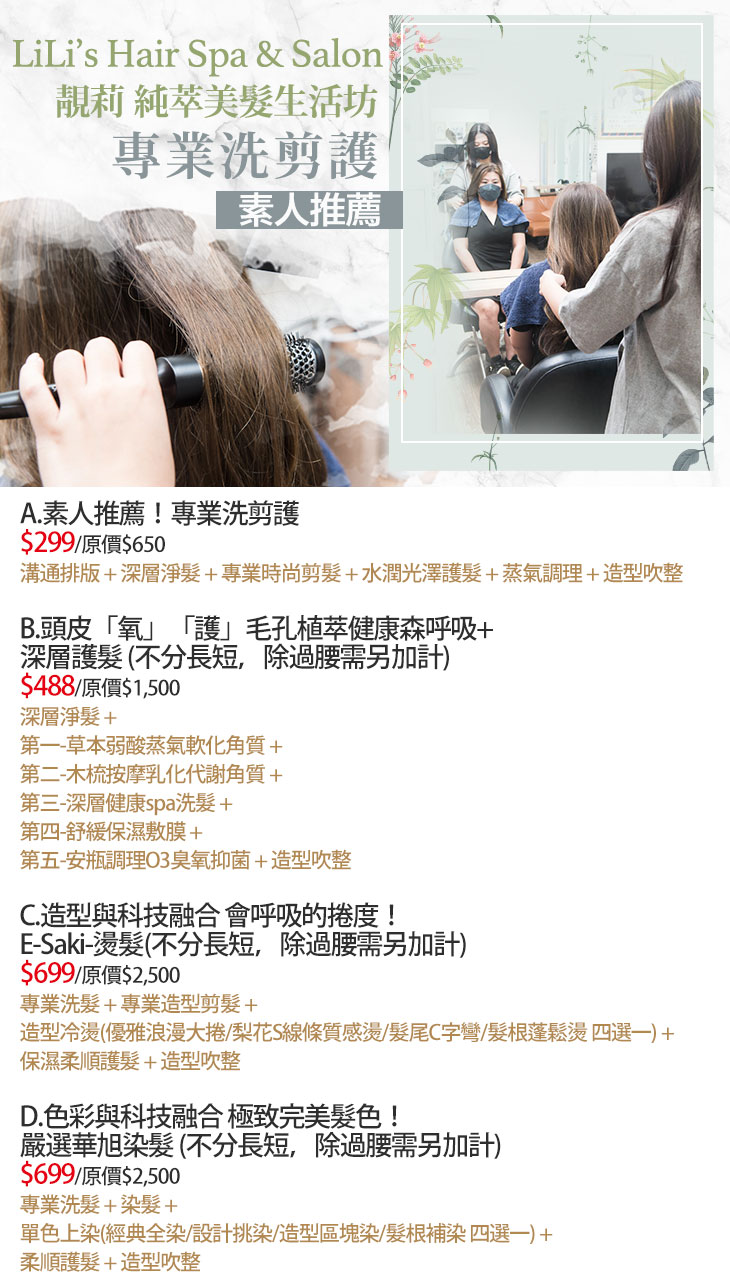 A.素人推薦!專業洗剪護 / B.頭皮「氧」「護」毛孔植萃健康森呼吸+深層護髮(不分長短,除過腰需另加計) / C.造型與科技融合 會呼吸的捲度!E-Saki-燙髮(不分長短,除過腰需另加計) / D.色彩與科技融合 極致完美髮色!嚴選華旭染髮(不分長短,除過腰需另加計)