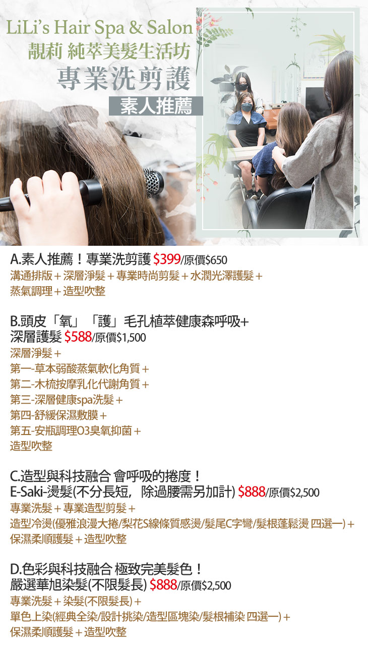 A.素人推薦!專業洗剪護 / B.頭皮「氧」「護」毛孔植萃健康森呼吸+深層護髮 / C.造型與科技融合 會呼吸的捲度!E-Saki-燙髮(不分長短,除過腰需另加計) / D.色彩與科技融合 極致完美髮色!嚴選華旭染髮(不限髮長)