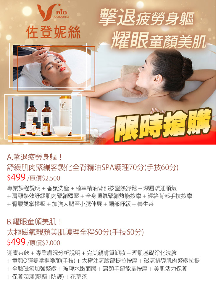 A.擊退疲勞身軀!舒緩肌肉緊繃客製化全背精油SPA護理70分(手技60分) / B.耀眼童顏美肌!太極磁氧靚顏美肌護理全程60分(手技60分)