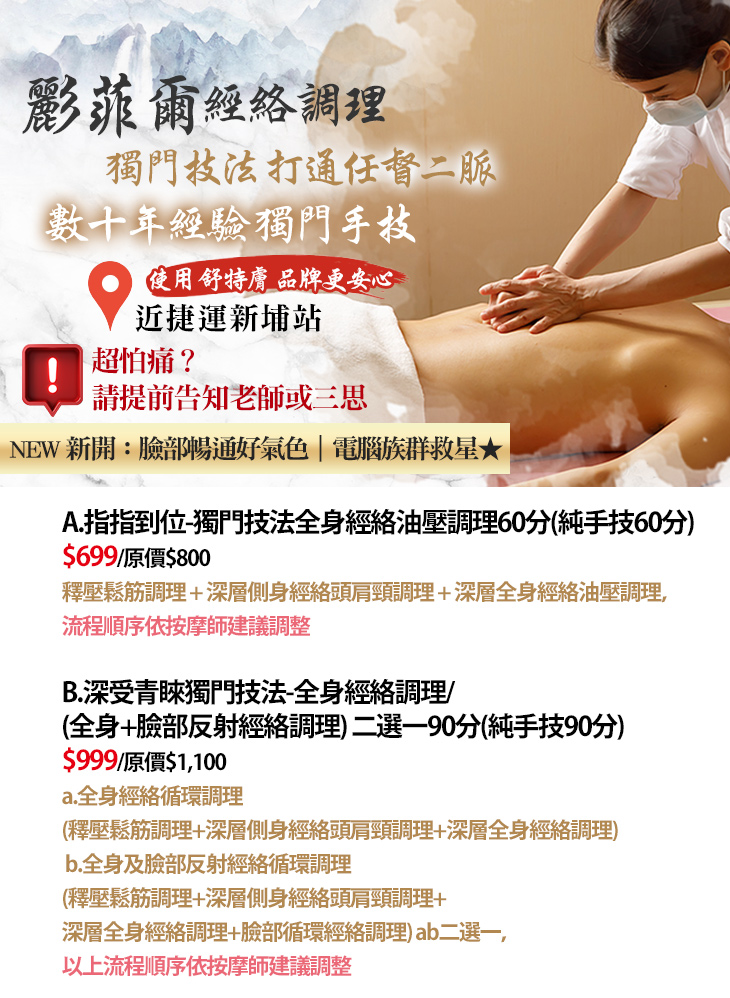 ★ B.深受青睞獨門技法-全身經絡調理/(全身+臉部反射經絡調理) 二選一90分(純手技90分)