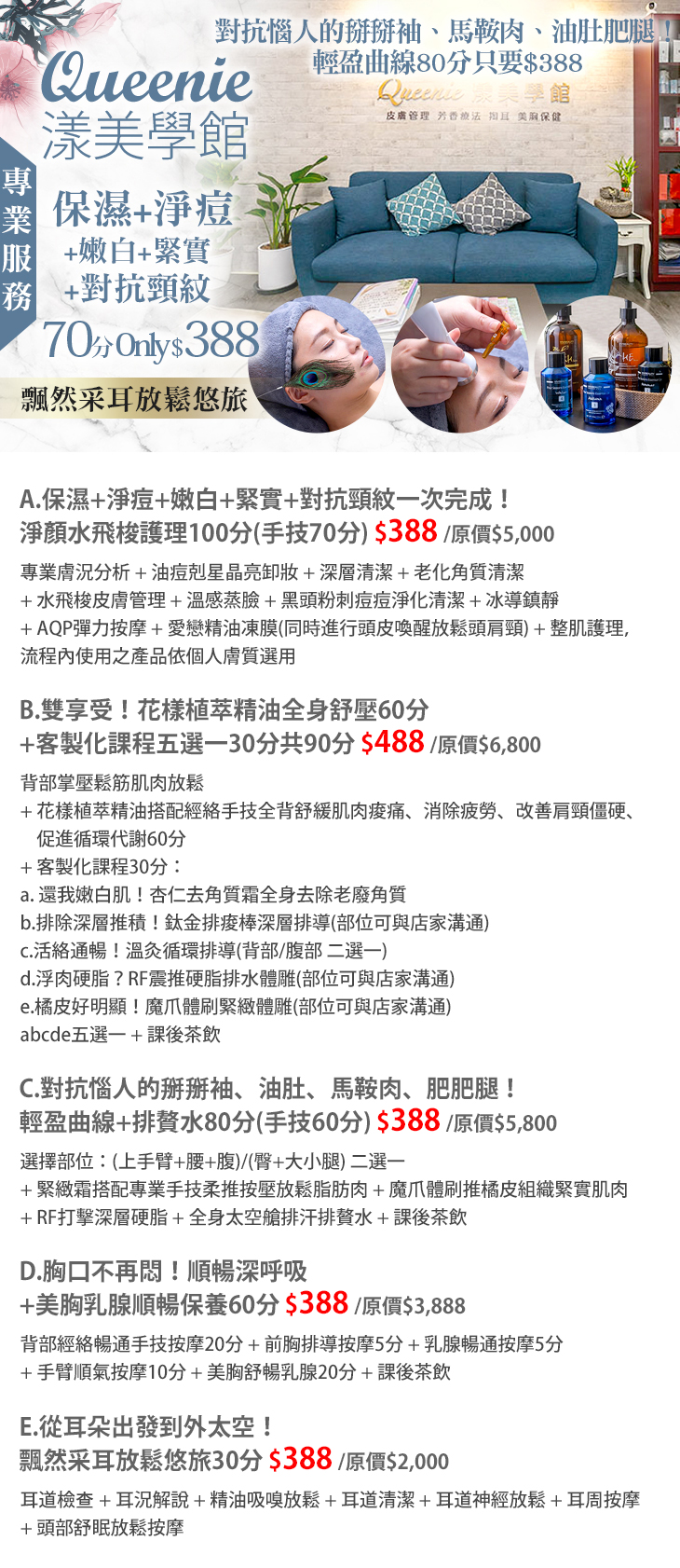A.保濕+淨痘+嫩白+緊實+對抗頸紋一次完成!淨顏水飛梭護理100分(手技70分) / B.雙享受!花樣植萃精油全身舒壓60分+客製化課程五選一30分共90分 / C.對抗惱人的掰掰袖、油肚、馬鞍肉、肥肥腿!輕盈曲線+排贅水80分(手技60分) / D.胸口不再悶!順暢深呼吸+美胸乳腺順暢保養60分 / E.從耳朵出發到外太空!飄然采耳放鬆悠旅30分