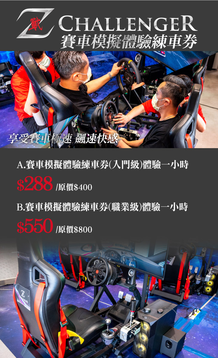 對於賽車很有興趣的朋友,建議可以先從入門級開始體驗,服務人員會在一旁耐心指導,操作更好上手 ~ 如果已有模擬賽車的經驗,想更上一層樓就推薦您職業級體驗,在設備上比入門級還專業許多,完美比照一般職業模擬賽車的規格,透過慢慢練習,初學者也能獲得很好的成績,說不定還能一起躍上國際舞台,參與 Z Challenger 主辦的實體賽車、電競賽車比賽唷!