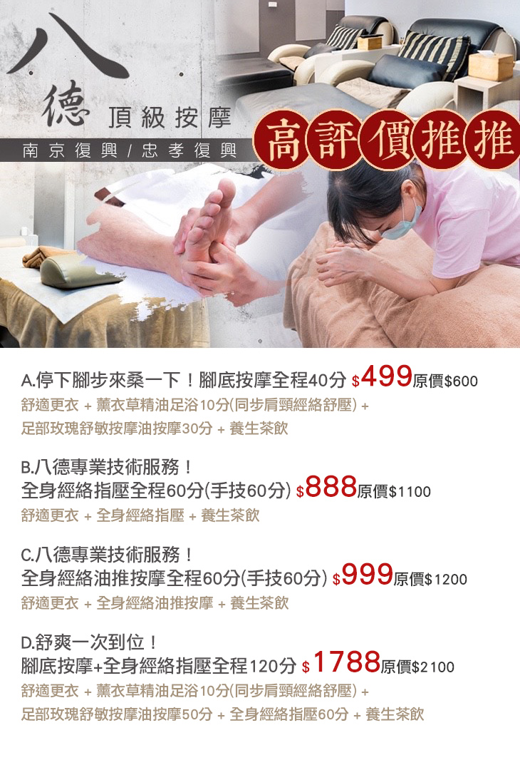 A.停下腳步來桑一下!腳底按摩全程40分 / B.八德專業技術服務!全身經絡指壓全程60分(手技60分) / C.八德專業技術服務!全身經絡油推按摩全程60分(手技60分) / D.舒爽一次到位!腳底按摩+全身經絡指壓全程120分