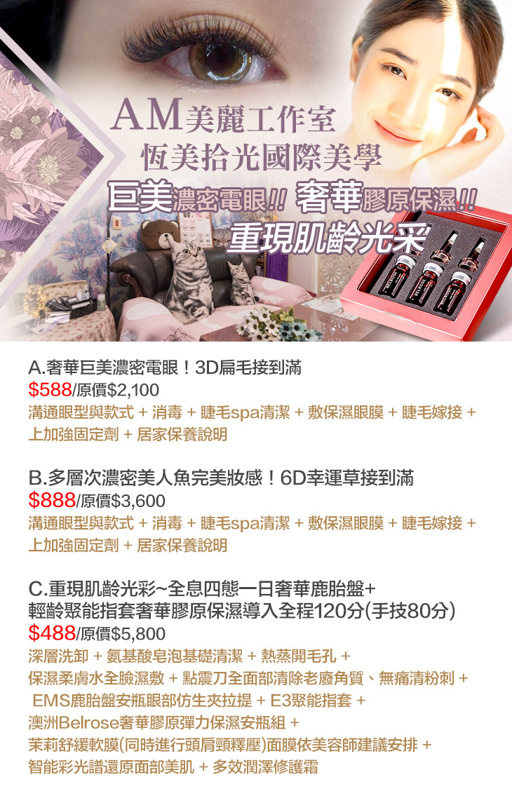 A.奢華巨美濃密電眼!3D扁毛接到滿 / B.多層次濃密美人魚完美妝感!6D幸運草接到滿 / C.重現肌齡光彩~全息四態一日奢華鹿胎盤+輕齡聚能指套奢華膠原保濕導入全程120分(手技80分)