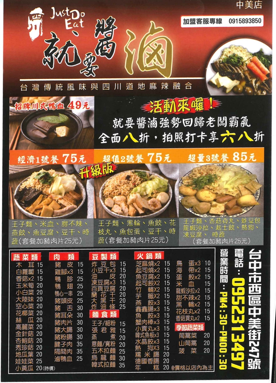 〝Just do EAT!〞吃滷味,就是要吃【就要醬滷】!獨門滷汁,將傳統的台灣風味,融合香麻勁辣、道地的四川麻辣結合,鹹香醇厚、辣而不燥、恰到好處的調味,將新鮮時蔬、嫩肉,以及小品佐料入味得香氣四溢、迷人萬分~肚子餓了嗎?現在就來外帶一份飄香萬里的滷味回家大快朵頤吧!