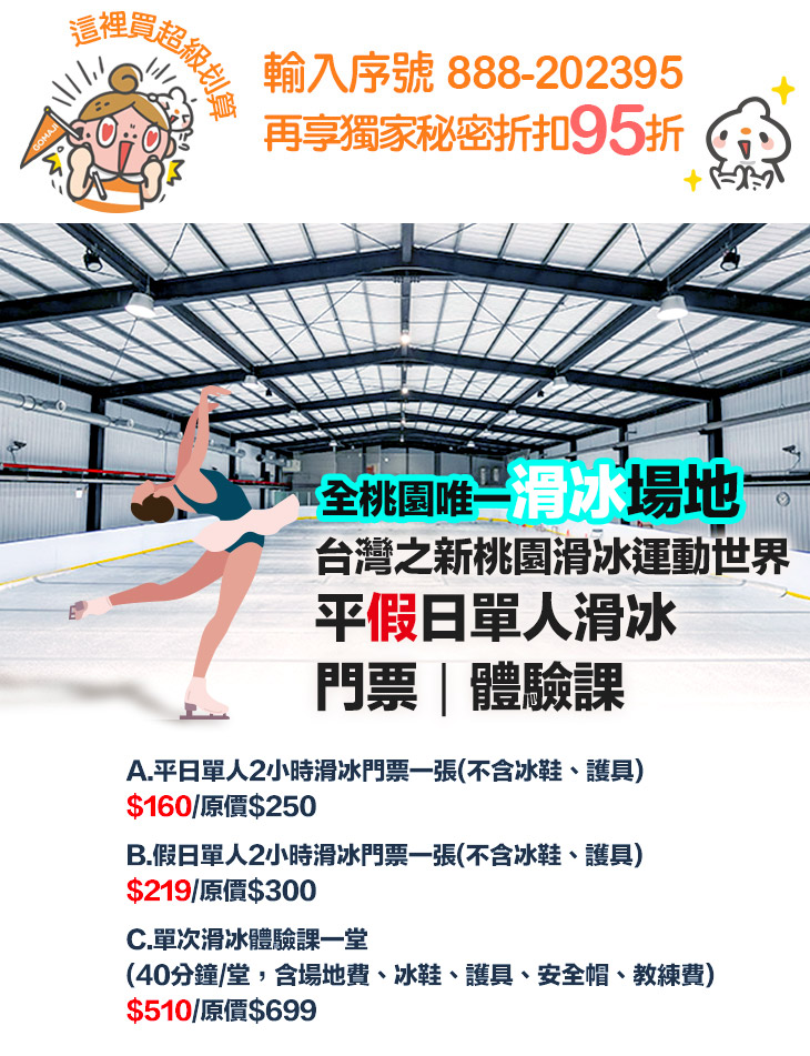 A.平日單人滑冰門票一張(不含冰鞋、護具) / B.假日單人滑冰門票一張(不含冰鞋、護具) / C.單次滑冰體驗課一堂(40分鐘/堂,含場地費、冰鞋、護具、安全帽、教練費)