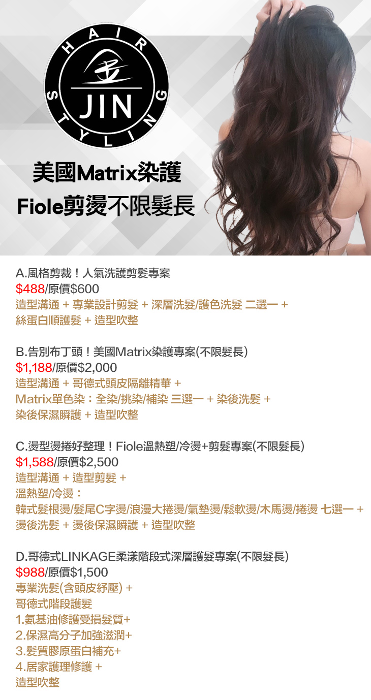 A.風格剪裁!人氣洗護剪髮專案 / B.告別布丁頭!美國Matrix染護專案(不限髮長) / C.燙型燙捲好整理!Fiole溫熱塑/冷燙+剪髮專案(不限髮長) / D.哥德式LINKAGE柔漾階段式深層護髮專案(不限髮長)
