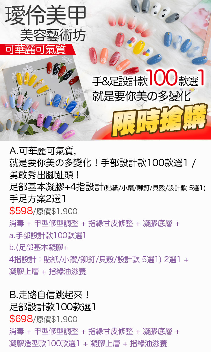 A.可華麗可氣質,就是要你美の多變化!手部設計款100款選1 / 勇敢秀出腳趾頭!足部基本凝膠+4指設計(貼紙/小鑽/鉚釘/貝殼/設計款 5選1) 手足方案2選1