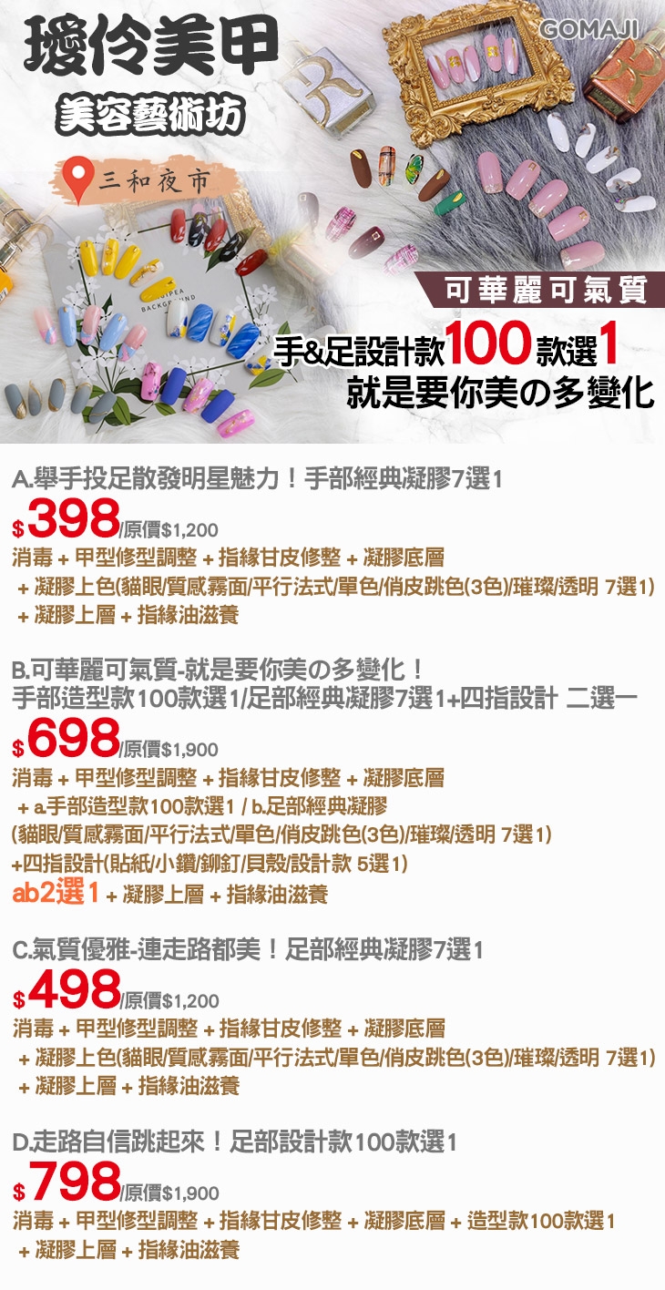 A.舉手投足散發明星魅力!手部經典凝膠7選1 / B.可華麗可氣質,就是要你美の多變化!手部造型款100款選1/足部經典凝膠7選1+4指設計 2選1 / C.氣質優雅,連走路都美!足部經典凝膠7選1 / D.走路自信跳起來!足部設計款100款選1