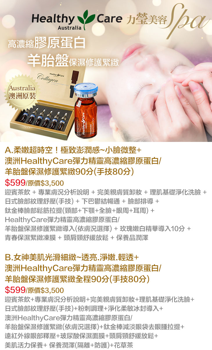 B.女神美肌光滑細緻~透亮.淨嫩.輕透+澳洲HealthyCare彈力精靈高濃縮膠原蛋白/羊胎盤保濕修護緊緻全程90分(手技80分)