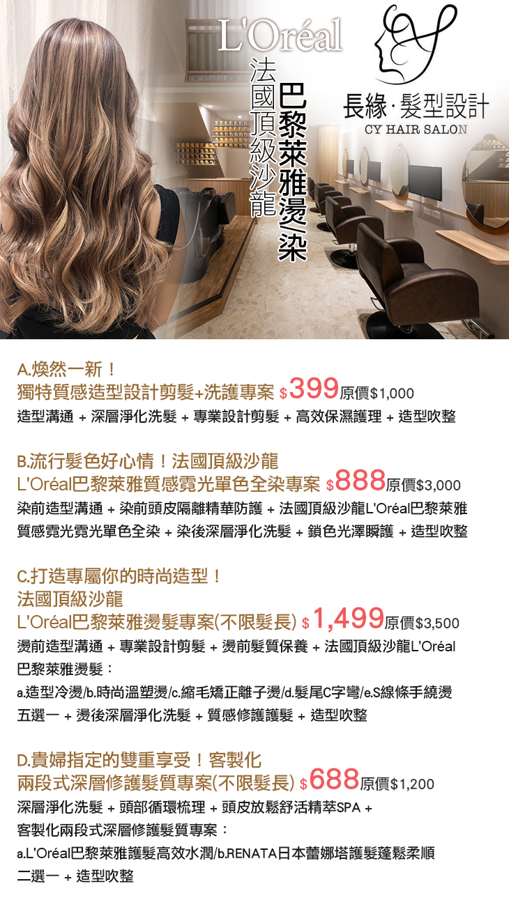 A.煥然一新!獨特質感造型設計剪髮+洗護專案 / B.流行髮色好心情!法國頂級沙龍L'Oréal巴黎萊雅質感霓光單色全染專案 / C.打造專屬你的時尚造型!法國頂級沙龍L'Oréal巴黎萊雅燙髮專案(不限髮長) / D.貴婦指定的雙重享受!客製化兩段式深層修護髮質專案(不限髮長)