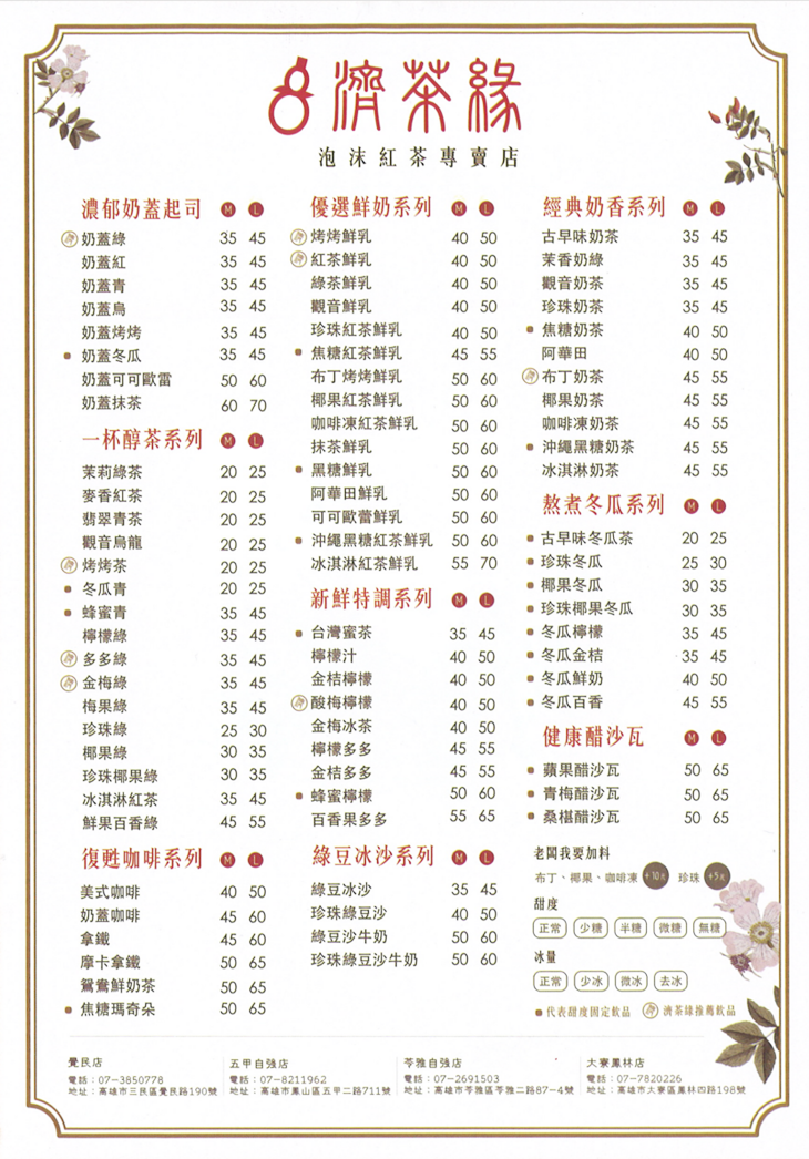 一杯茶一個緣,濟茶緣讓您感受幸福的味道!店面相當的簡潔、明亮,看起來十分有活力!每日新鮮沖煮的純茶,搭配優質鮮乳、現煮珍珠等,精心調配一杯杯飲品,就是要讓您品味最香、最美味、最純淨的好茶飲!濟茶緣的用心,您喝了就知道!