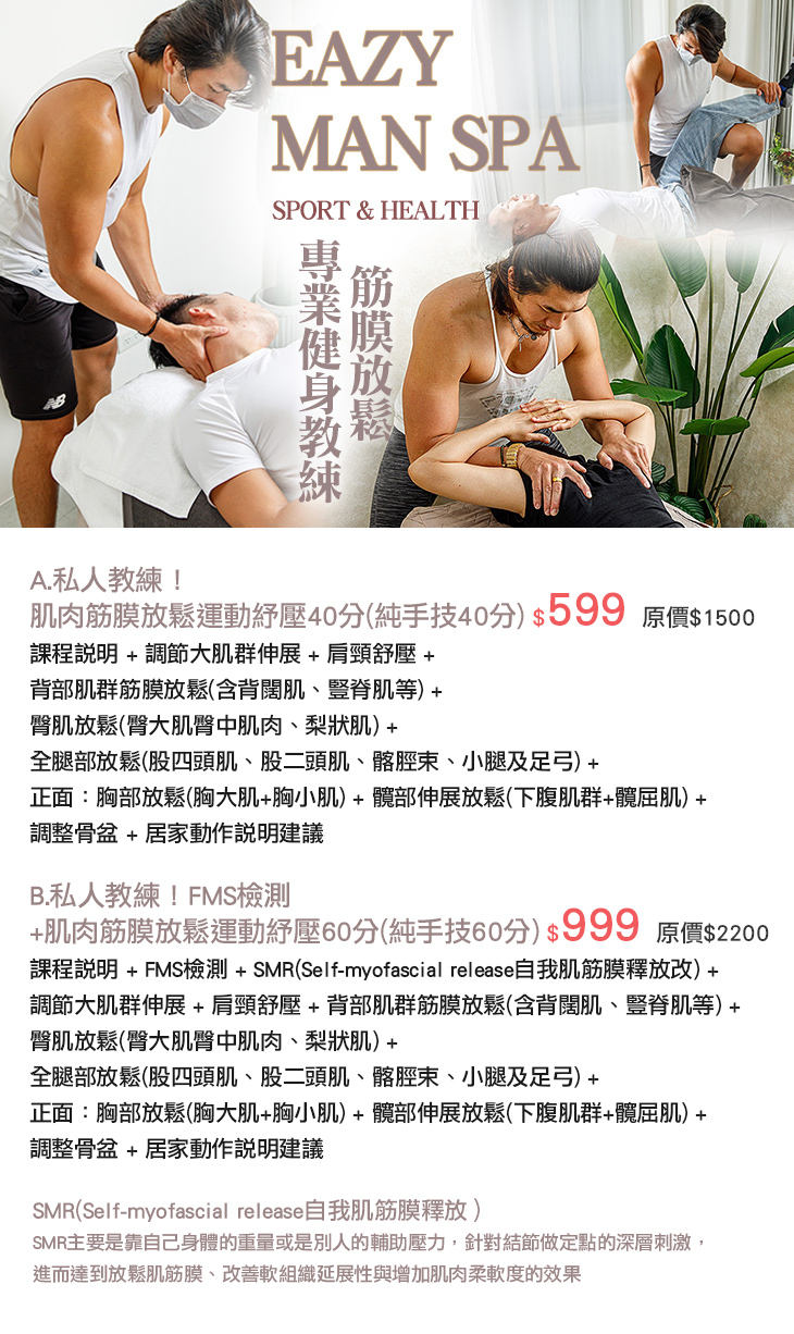 A.私人教練!肌肉筋膜放鬆運動紓壓40分(純手技40分) / B.私人教練!FMS檢測+肌肉筋膜放鬆運動紓壓60分(純手技60分)