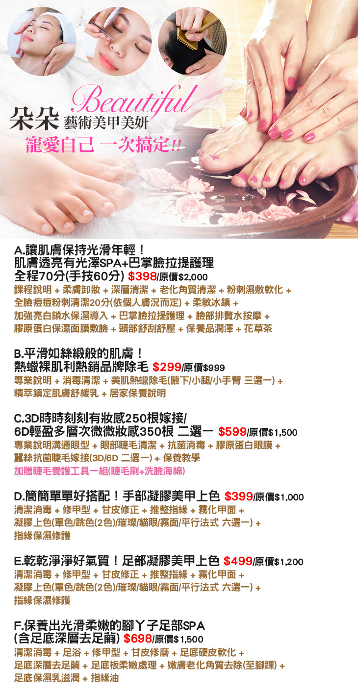 A.讓肌膚保持光滑年輕!肌膚透亮有光澤SPA+巴掌臉拉提護理全程70分(手技60分) / B.平滑如絲緞般的肌膚!熱蠟裸肌利熱銷品牌除毛 / C.3D時時刻刻有妝感250根嫁接/6D輕盈多層次微微妝感350根 二選一 / D.簡簡單單好搭配!手部凝膠美甲上色 / E.乾乾淨淨好氣質!足部凝膠美甲上色 / F.保養出光滑柔嫩的腳丫子足部SPA(含足底深層去足繭)