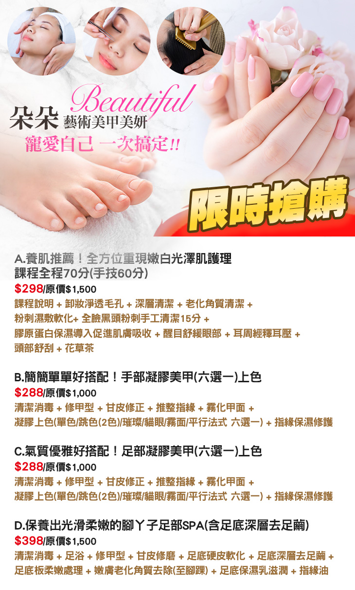 A.養肌推薦!全方位重現嫩白光澤肌護理課程全程70分(手技60分) / B.簡簡單單好搭配!手部凝膠美甲(六選一)上色 / C.氣質優雅好搭配!足部凝膠美甲(六選一)上色 / D.保養出光滑柔嫩的腳丫子足部SPA(含足底深層去足繭)