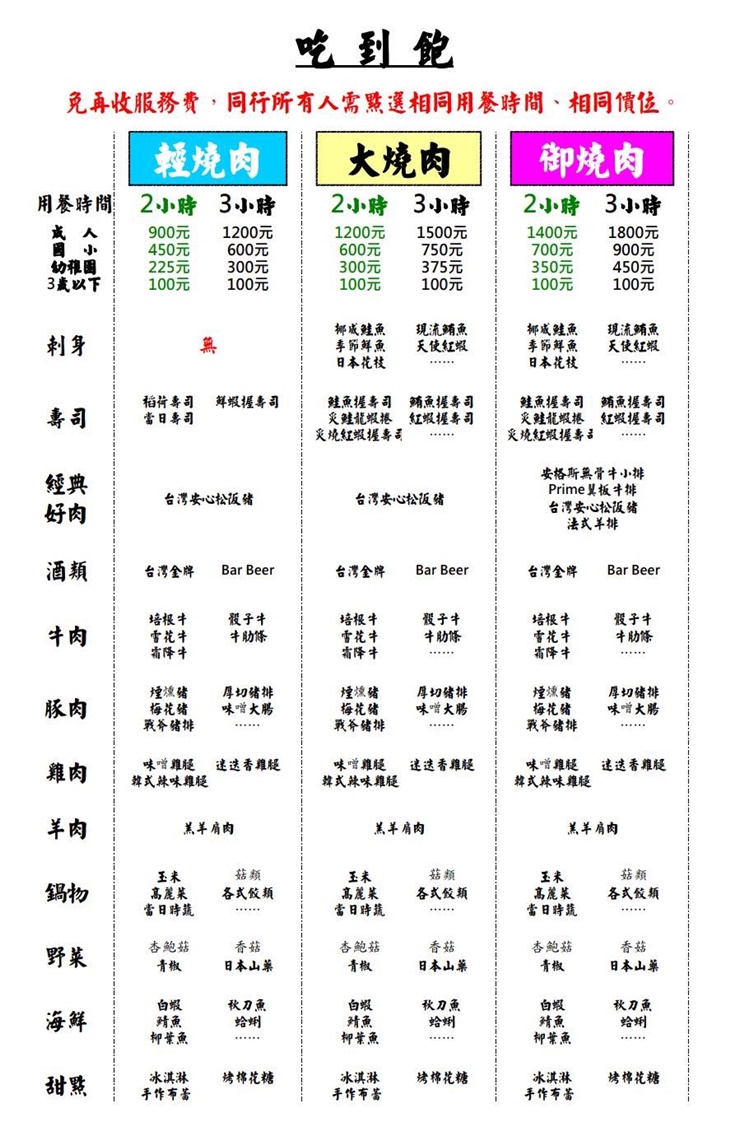 A.輕燒肉2小時每人吃到飽 / B.大燒肉2小時每人吃到飽