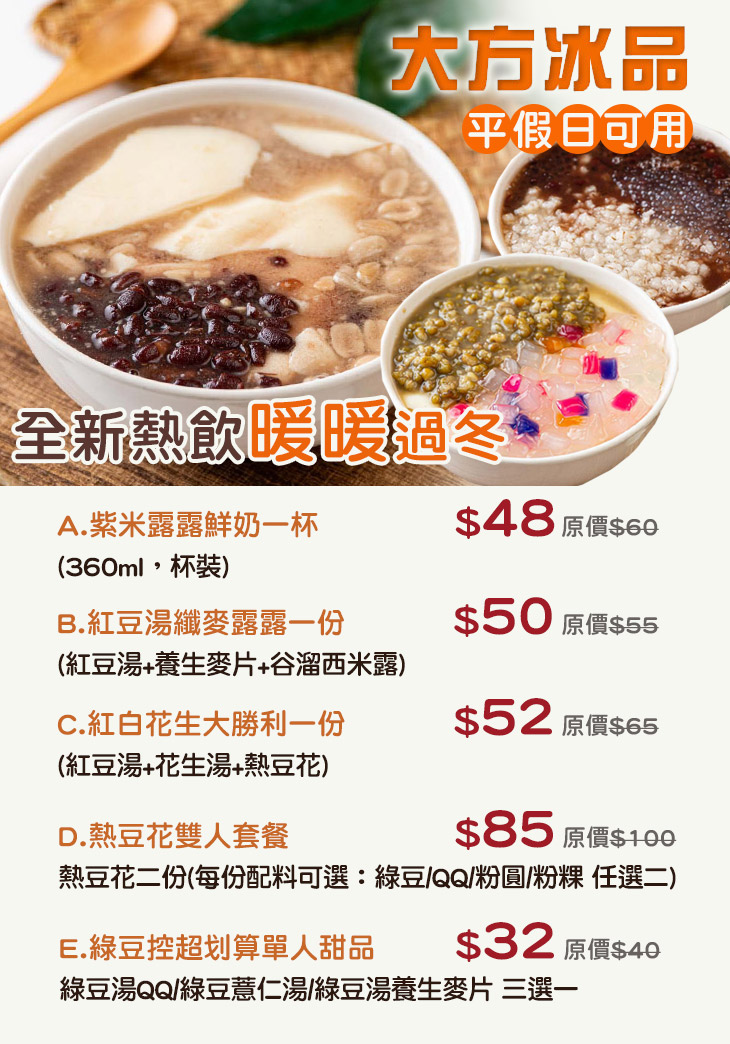 A.紫米露露鮮奶一杯(360ml,杯裝) / B.紅豆湯纖麥露露一份(紅豆湯+養生麥片+谷溜西米露) / C.紅白花生大勝利一份(紅豆湯+花生湯+熱豆花) / D.熱豆花雙人套餐 / E.綠豆控超划算單人甜品