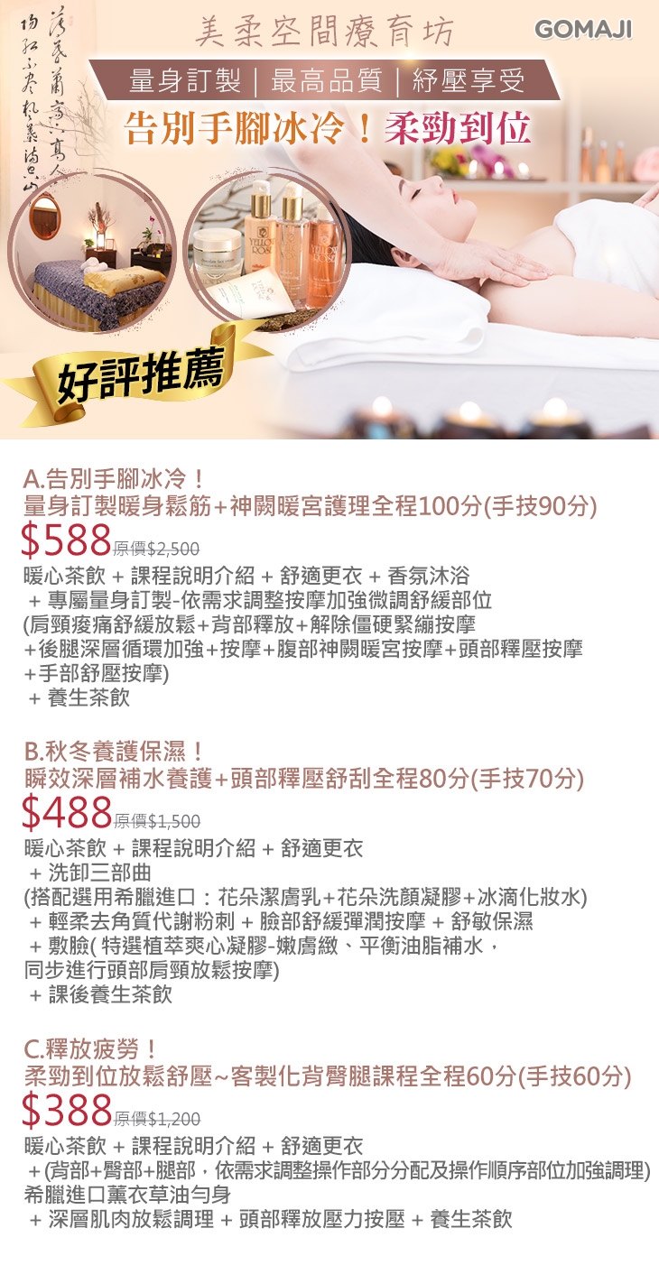 A.告別手腳冰冷!量身訂製暖身鬆筋+神闕暖宮護理全程100分(手技90分) / B.秋冬養護保濕!瞬效深層補水養護+頭部釋壓舒刮全程80分(手技70分) / C.釋放疲勞!柔勁到位放鬆舒壓~客製化背臀腿課程全程60分(手技60分)