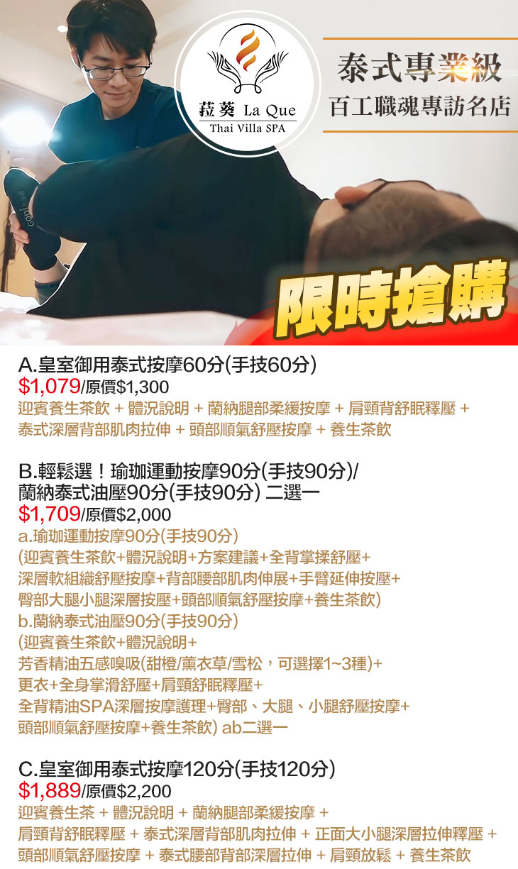 A.皇室御用泰式按摩60分(手技60分) / B.輕鬆選!瑜珈運動按摩90分(手技90分)/蘭納泰式油壓90分(手技90分) 二選一 / C.皇室御用泰式按摩120分(手技120分)