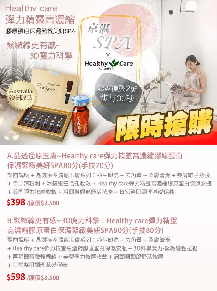 A.晶透還原玉膚~Healthy care彈力精靈高濃縮膠原蛋白保濕緊緻美妍SPA80分(手技70分) / B.緊緻線更有感~3D魔力科學!Healthy care彈力精靈高濃縮膠原蛋白保濕緊緻美妍SPA90分(手技80分)