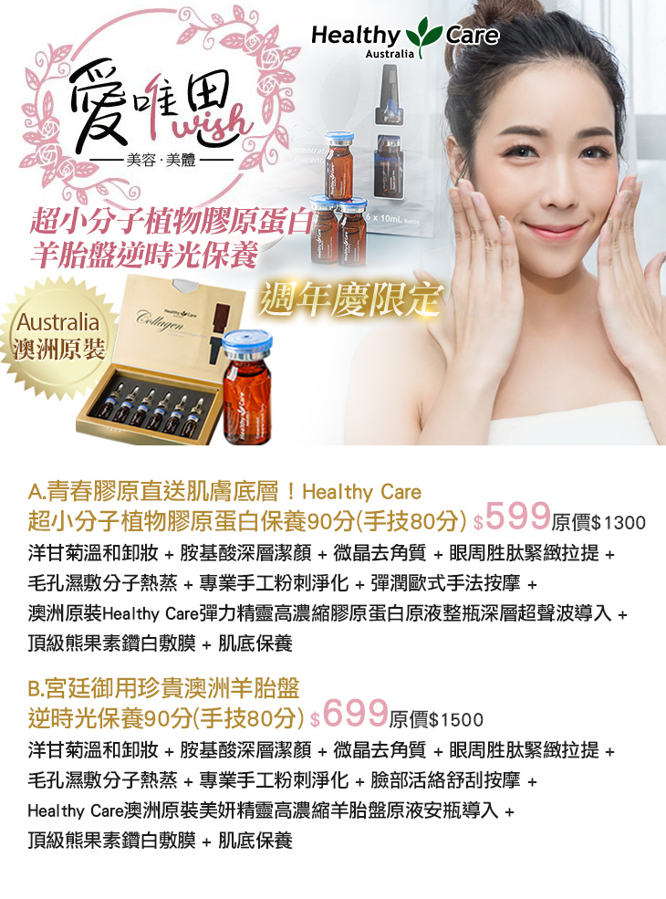 A.青春膠原直送肌膚底層!Healthy Care超小分子植物膠原蛋白保養90分(手技80分) / B.宮廷御用珍貴澳洲羊胎盤逆時光保養90分(手技80分)