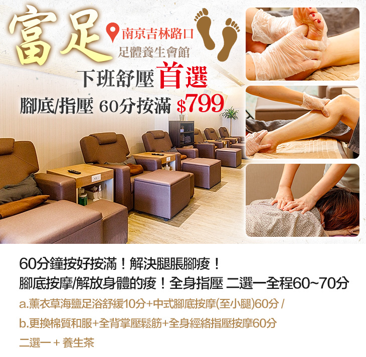 〈a.薰衣草海鹽足浴舒緩10分+中式腳底按摩(至小腿)60分 / b.更換棉質和服+全背掌壓鬆筋+全身經絡指壓按摩60分 二選一 + 養生茶〉