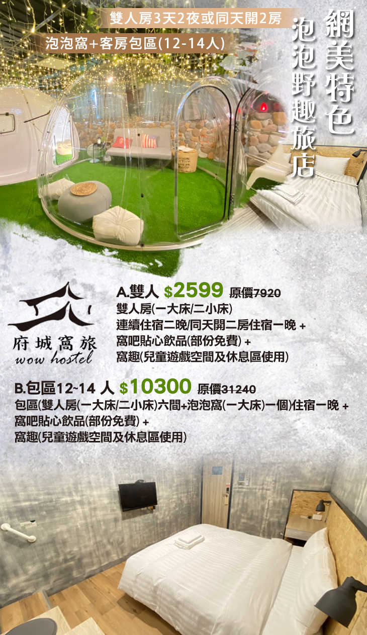 ★ 提供雙人房3天2夜或同天開2房/泡泡窩+客房包區,適合12-14人,適合情侶、家庭或團體旅遊,來趟新奇泡泡之旅!