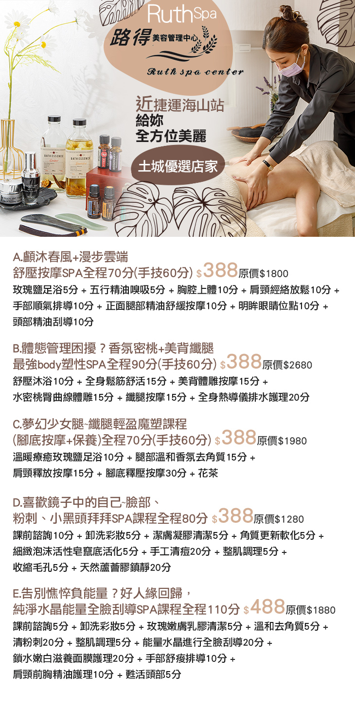 A.顱沐春風+漫步雲端舒壓按摩SPA全程70分(手技60分) / B.體態管理困擾?香氛密桃+美背纖腿 最強body塑性SPA全程90分(手技60分) / C.夢幻少女腿~纖腿輕盈魔塑課程(腳底按摩+保養)全程70分(手技60分) / D.喜歡鏡子中的自己~臉部、粉刺、小黑頭拜拜SPA課程全程80分 / E.告別憔悴負能量?好人緣回歸,純淨水晶能量全臉刮導SPA課程全程110分