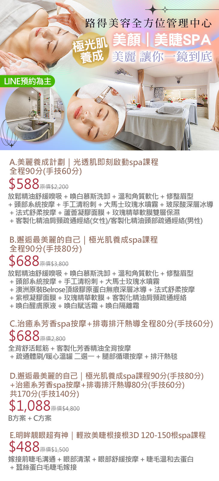 A.美麗養成計劃|光透肌即刻啟動spa課程全程90分(手技60分) / B.邂逅最美麗的自己|極光肌養成spa課程全程90分(手技80分) / C.治癒系芳香spa按摩+排毒排汗熱導80分(手技60分) / D.邂逅最美麗的自己|極光肌養成spa課程90分(手技80分)+治癒系芳香spa按摩+排毒排汗熱導80分(手技60分) / E.明眸靚眼超有神|輕妝美睫根接根3D 120-150根spa課程