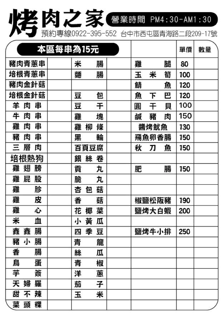 台中銅板美食口袋名單再+1!位於青海路及河南路交叉口的「李林烤肉之家」,專賣平價美味的各式串燒,以每串15元的賣點吸引目光,提供近60樣的新鮮食材給客人選擇,每一串肉品、蔬菜都很美味,佐以獨特醬料提香,濃郁好滋味讓人吃得意猶未盡!另外,店內也有供應圓干貝、魚下巴等特色料理,雖然價格較高,但新鮮度與調味比例都很好,也是許多客人來店必買的選擇唷 ~