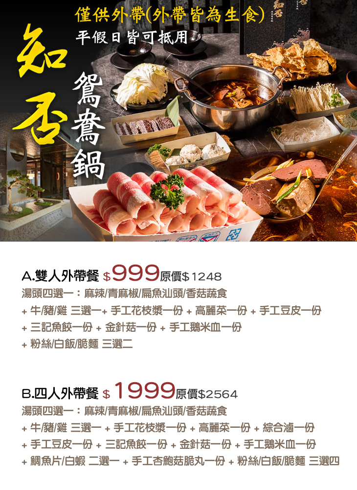 位於台中市西屯區四川路上的【知否鴛鴦鍋】,專營精緻美味的鴛鴦鍋,店內的食材嚴格把關,堅持肉品與海鮮新鮮至上,正因對食材的挑剔及對美味的講究,每每用餐時間一到,人潮總是絡繹不絕。精選高檔店家,快揪親朋好友一塊來嚐鮮看看吧!本次推出外帶方案,讓您也能將五星等級的奢華鍋物,輕鬆帶回家與心愛的家人一同大快朵頤!