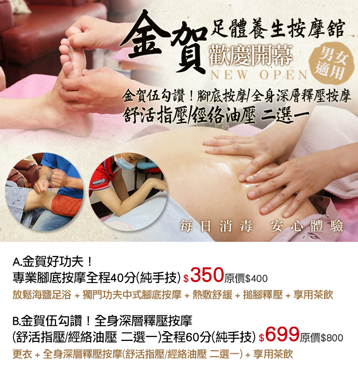 A.金賀好功夫!專業腳底按摩全程40分(純手技) / B.金賀伍勾讚!全身深層釋壓按摩(舒活指壓/經絡油壓 二選一)全程60分(純手技)