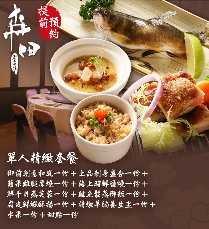 〈御前創意和風一份 + 上品刺身盛合一份 + 蘋果雞腿厚燒一份 + 海上時鮮鹽燒一份 + 鮮干貝蒸芙蓉一份 + 鮭魚鬆蒸御飯一份 + 腐皮鮮蝦酥揚一份 + 清燉羊腩養生盅一份 + 水果一份 + 甜點一份〉